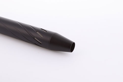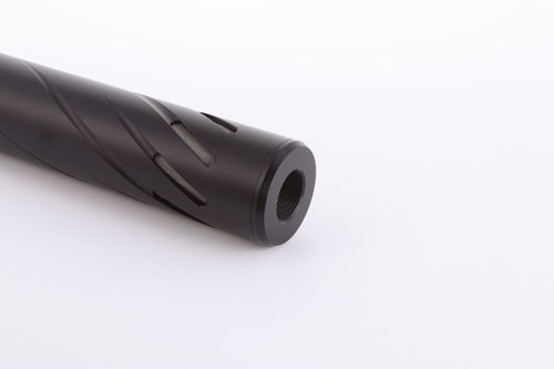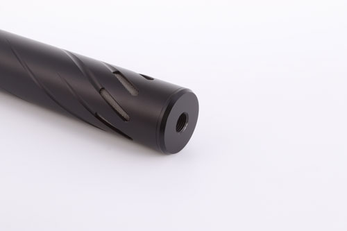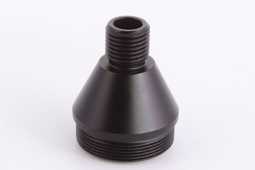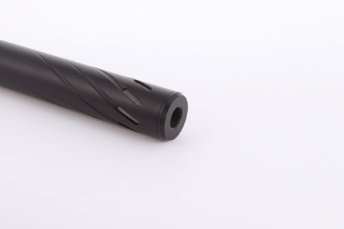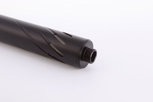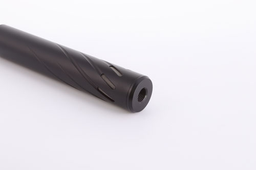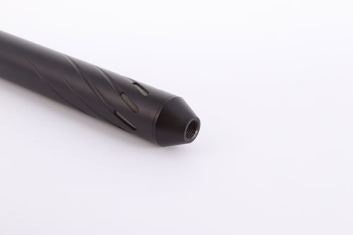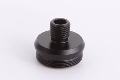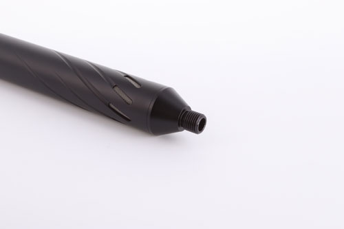 The Huggett ½″ UNF male tapered connector, with high quality matching finish, and below seen fitted to a Huggett Snipe S1 moderator.